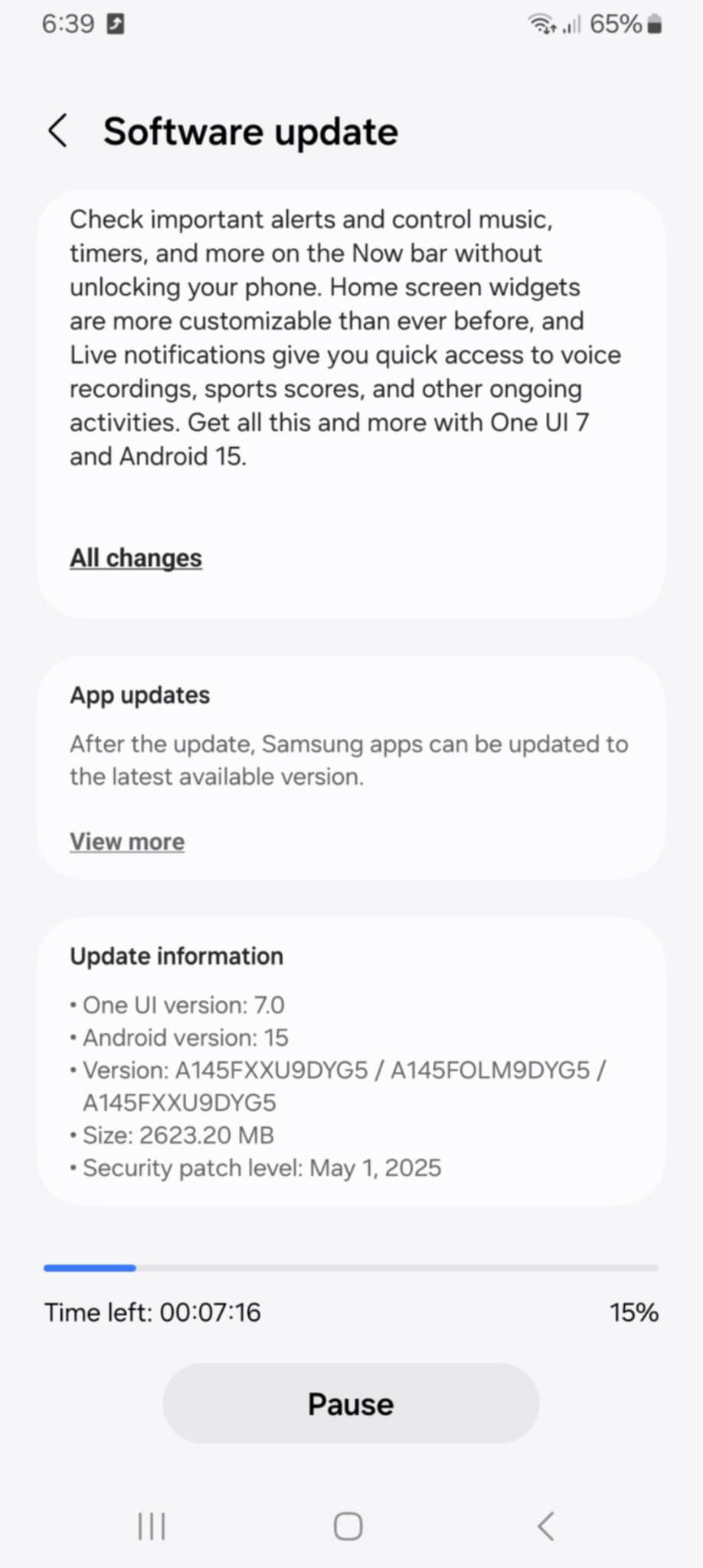 On Reddit, a Galaxy A14 LTE user reports that their device has received a software update that offers Android 15-based One UI 7.0. Going by the screenshot, it looks like the brand is offering the update to the variant of the phone that it sells in Africa, Asia, and the Middle East, which has the model number SM-A145F. The update is 2,623.20MB in size and carries firmware version A145FXXU9DYG5. It also brings the May 2025 security patch.