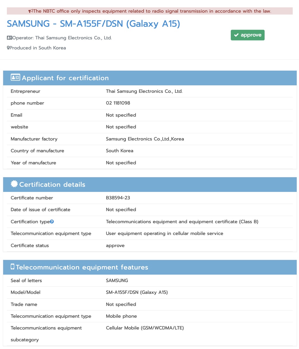 The Galaxy A15 will be available in both 4G and 5G versions. The 4G version of the Galaxy A15 has appeared in NBTC's certification database. It has model number SM-A155F/DSN, which confirms that the phone has a dual-SIM card slot and that it will launch sooner rather than later. Previous reports have revealed that the Galaxy A15 4G uses a MediaTek Helio G99 processor, which has two high-performance Cortex-A76 CPU cores clocked at 2.2GHz and six power-efficient Cortex-A55 CPU cores clocked at 2GHz. The 5G version of the phone will use the MediaTek Dimensity 6100+ processor.