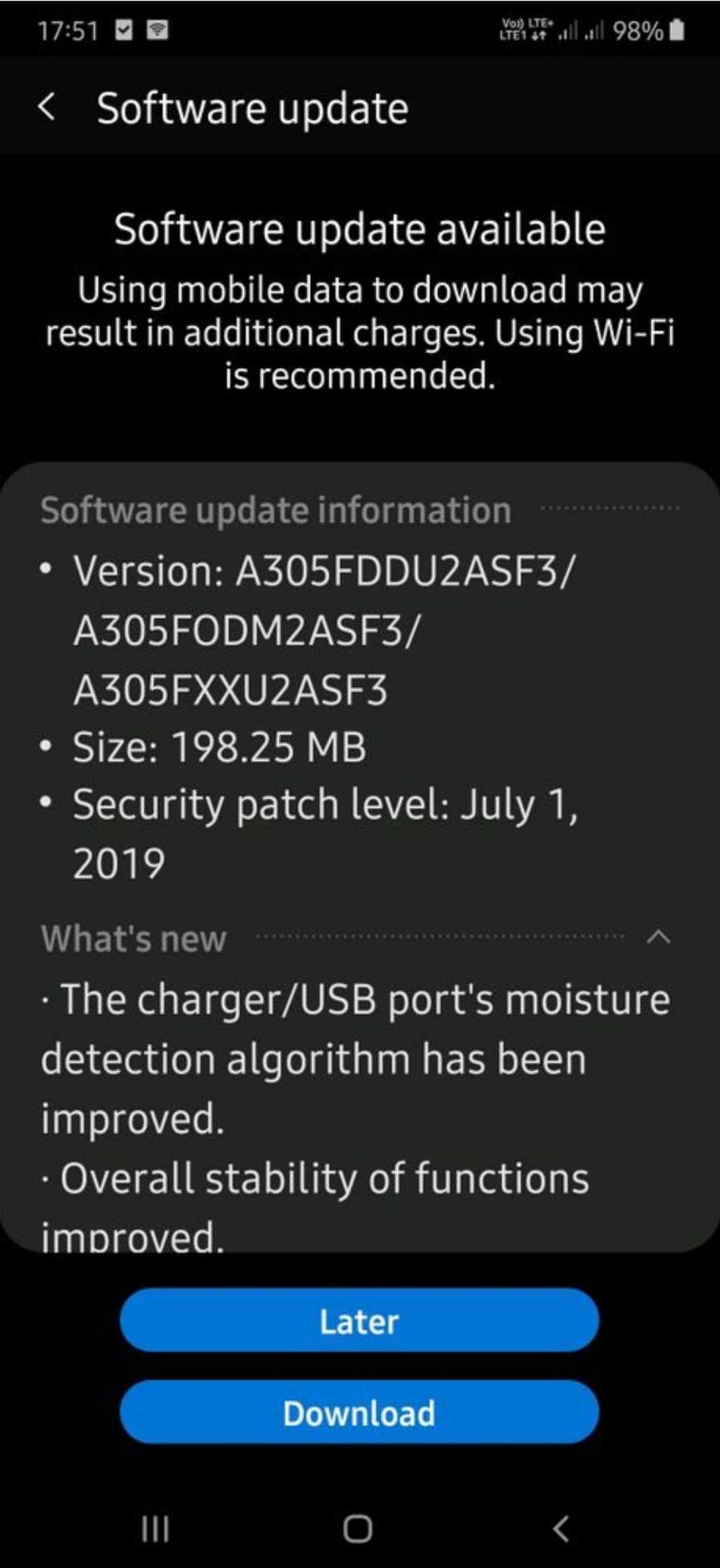Aside from these general security issues which have now been fixed, the July 2019 security update rolling out to the Galaxy A30 is also bringing better stability and some changes to the moisture detection algorithm. Specifically, the changelog mentions that “The charger/USB port’s moisture detection algorithm has been improved.” It’s not exactly clear why Samsung felt the need to tweak it, but various phone models have had an issue with false warnings.