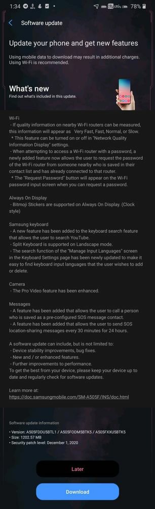 The Galaxy A50 is now receiving the One UI 2.5 update in India and Sri Lanka. The latest update with firmware version A505FDDU5BTL1 has a file size of 1,202.57MB and it brings along the December 2020 security patch. The Galaxy A90 5G's new firmware version is A908NKSU3CTL3 and it is now rolling out in South Korea.