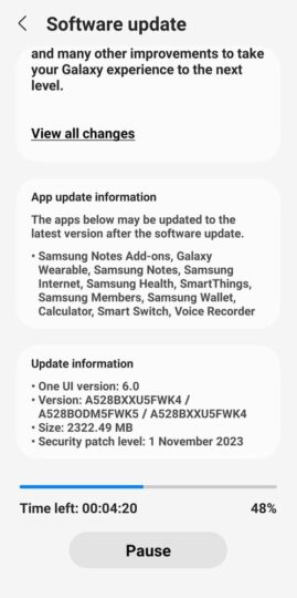The Android 14-based One UI 6.0 update for the Galaxy A52s 5G is now available in India. The update comes with firmware version A528BXXU5FWK4, which has a download size of around 2.32GB. It includes the November 2023 security patch that fixes around 75 security flaws discovered in the previous software version. The update could be released in more countries soon.