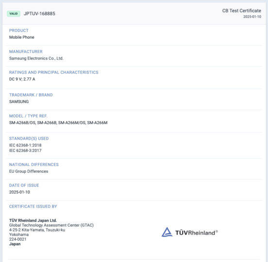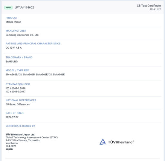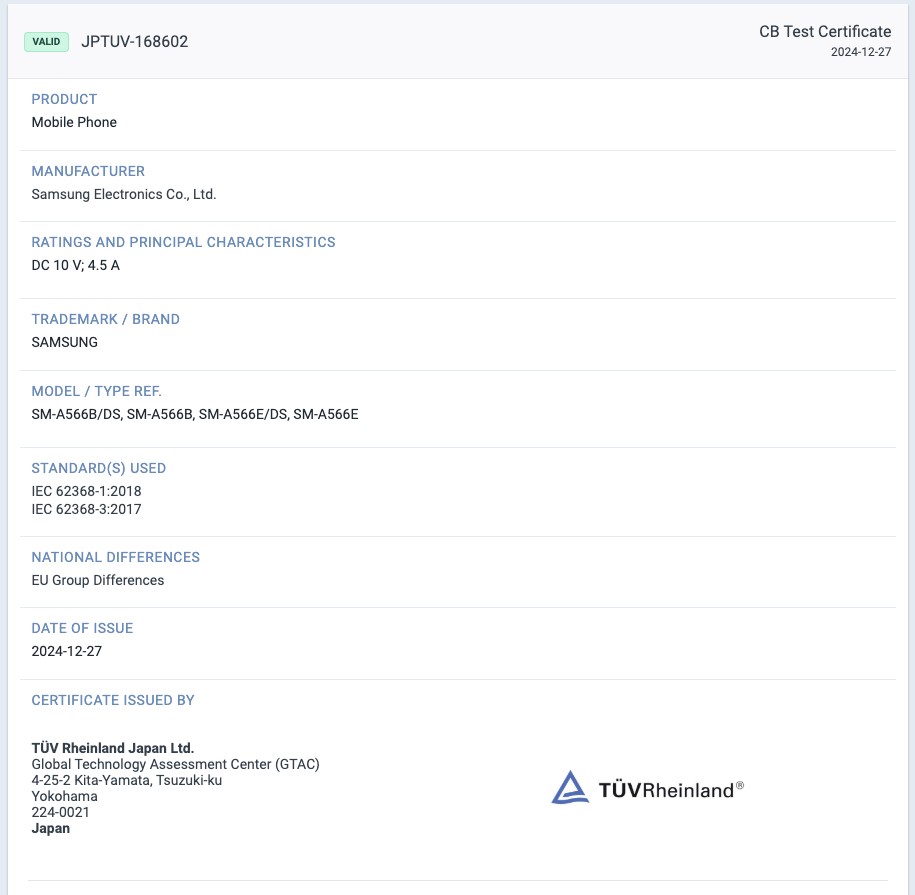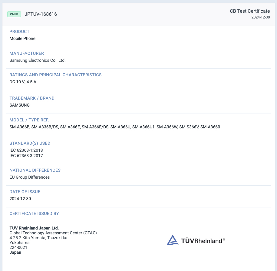 TUV Rheinland has certified the Galaxy A56, Galaxy A36, and Galaxy A26 (via TheTechOutlook). It reveals that the Galaxy A56 and the Galaxy A36 support charging speed at 10V and 4.5A and the Galaxy A26 supports charging speed at 9V and 2.77A. That means the first two devices can charge at up to 45W and the third one can charge at up to 25W.