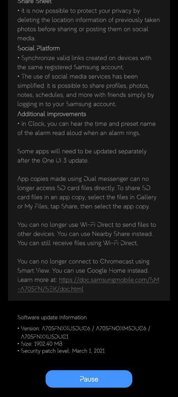 The update includes the March 2021 security patch, which was detailed by Samsung at the beginning of the month. It addresses a handful of vulnerabilities affecting the Exynos 990 chipset — though this obviously doesn't concern Galaxy A70 owners — as well as other vulnerabilities found within Google's own software.