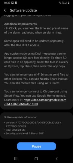 Samsung has started rolling out the Android 11-based One UI 3.1 update to the Galaxy A70s in India. The new update, which has firmware version A707FDDU3CUC6, also brings along the March 2021 security patch to the phone. The software update has a download size of over 2GB, so we advise you to use a Wi-Fi network to download it.