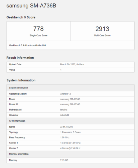 You can be certain that the majority of Galaxy phones planned for release in 2022 will run Android 12 out of the box. The Galaxy A73 5G does, according to the benchmark. In addition, the phone will pair the Snapdragon 778G SoC with 8GB of RAM.