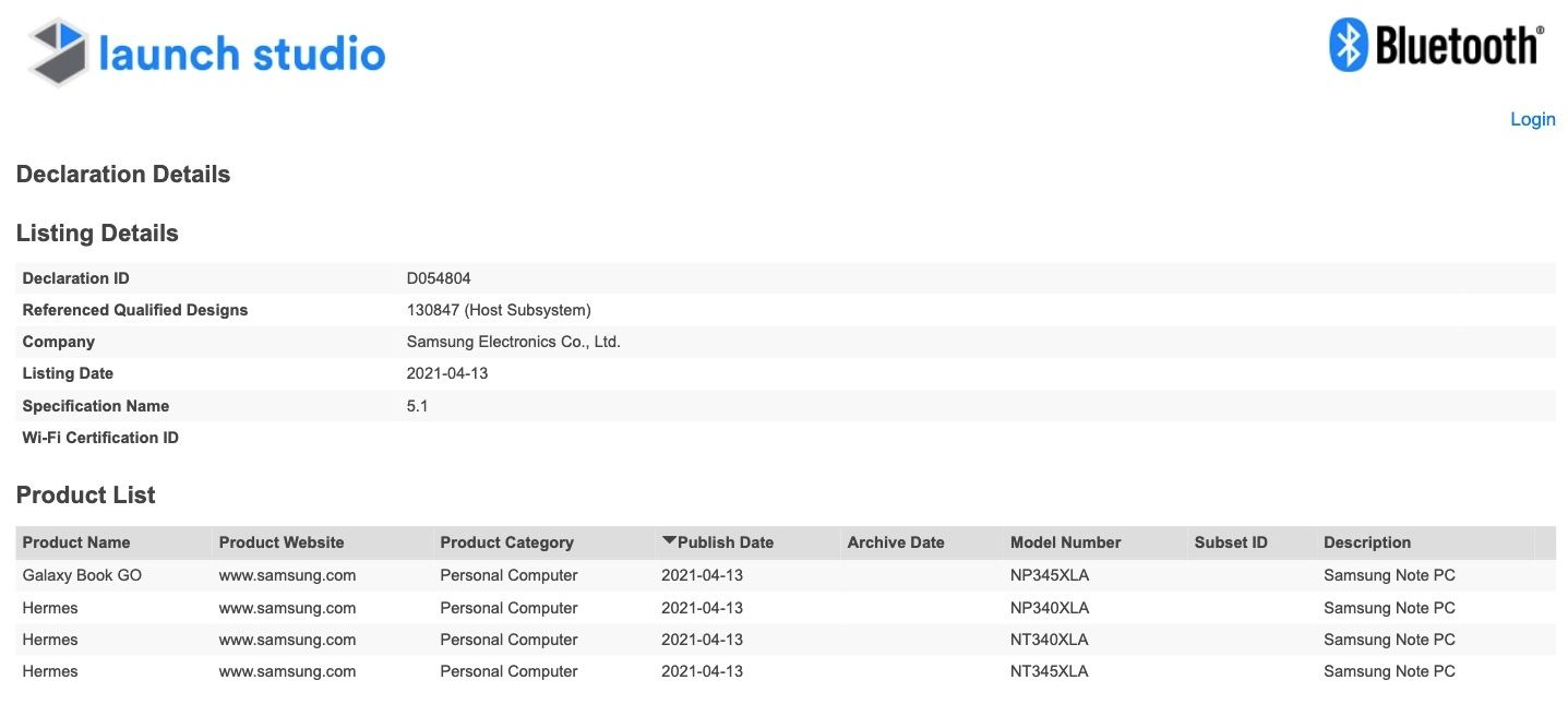 The Galaxy Book Go (with model number NP340XLA and NP345XLA) has now cleared Bluetooth SIG's and FCC's certification. Going by the certification documents, Samsung's upcoming ARM-based laptop features dual-band Wi-Fi b/g/n/ac, Bluetooth 5.1, LTE, and 34.5W charging. Going by previous leaks, the Galaxy Book Go will feature a 14-inch display with Full HD resolution, Windows 10 Home operating system, a next-generation Snapdragon 7c/Snapdragon 8cx processor, 4GB/8GB LPDDR4X RAM, 128GB/256GB storage, and a microSD card slot.