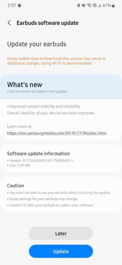 This Galaxy Buds 2 update has been released worldwide, so everyone who owns these wireless earbuds can install the update right away. To install the update, head over to the Galaxy Wearable app and navigate to Earbuds settings » Earbuds software update and then tap on Update.