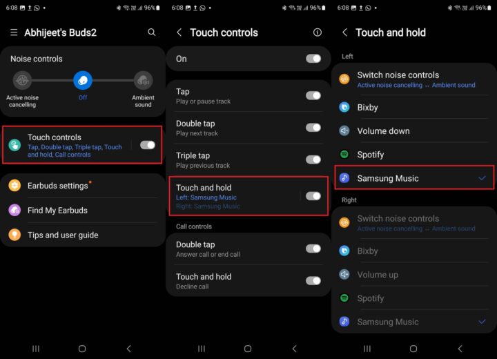 Download the latest version of Samsung Music from the Galaxy Store or Play Store. Then, to assign the touch and hold gesture to Samsung Music, open the Galaxy Wearable app (simply called Wearable on devices running One UI 6.0 and above) on the phone or tablet that is connected to the earbuds, hit the Touch controls option, tap the Touch and hold button, and select Samsung Music from the list.