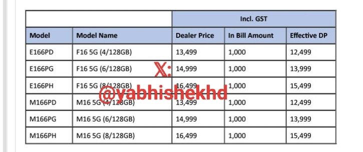 Abhishek Yadav has revealed prices of the Galaxy F16 5G and Galaxy M16 5G for India. Samsung will launch each phone in three configurations: 4GB RAM + 128GB storage, 6GB RAM + 128GB storage, and 8GB RAM + 128GB storage. Both phones start at INR 13,499 and go up to INR 16,499. You can check out variant-wise prices below.