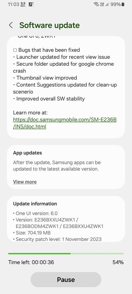 The latest One UI 6.0 beta update (via @SamsungSWUpdate) for the Galaxy F23 comes with firmware version E236BXXU4ZWK1. It has a download size of around 704MB and brings the November 2023 security patch. It is a bug-fixing update and focuses on improving the stability and reliability of the software. According to the changelog, the third One UI 6.0 beta update fixes an issue that appeared in the app launcher's multitasking menu. It also updates Secure Folder to stop Google Chrome inside it from crashing.