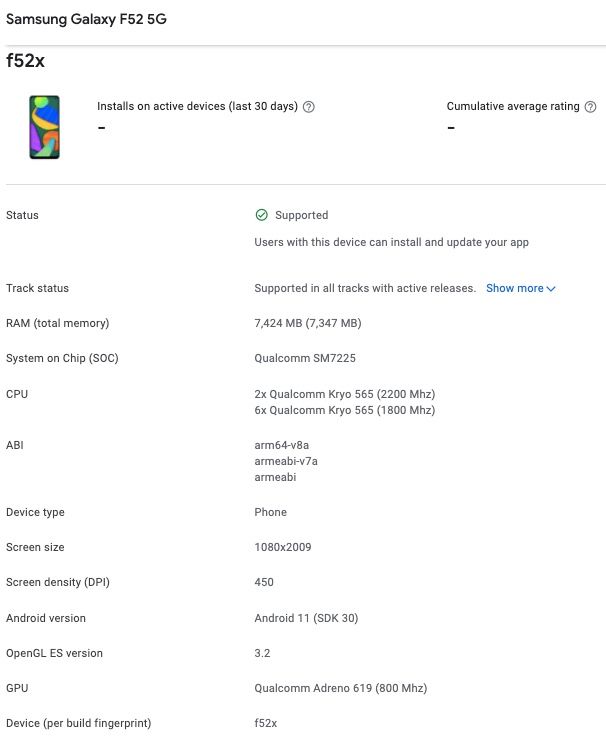 The Galaxy F52 5G, which has model number SM-E5260, appeared in the Google Play Console list earlier today. According to the information that is currently available, the Galaxy F52 5G features an Infinity-O display with Full HD+ resolution and runs Android 11 (most probably with One UI 3.1) out of the box. The phone comes equipped with the Snapdragon 750G processor (with Adreno 619 GPU) and 8GB of RAM. The phone's punch-hole selfie camera appears to be placed towards the top right corner of the screen.