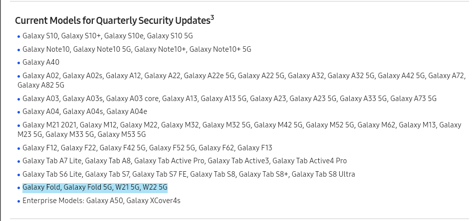 Even though Samsung released the W21 and W22 in late 2020 and 2021, these newer devices also joined the original Galaxy Fold to the quarterly security update schedule.
