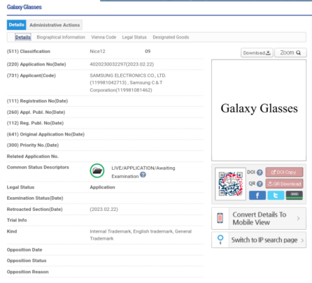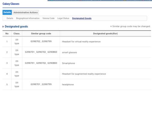 According to KIPRIS, this upcoming headset could be called “Galaxy Glasses.” Or, at the very least, Samsung trademarked this name to prevent anyone else from using it. Either way, the Galaxy Glasses are classified under goods including “headset for virtual reality experience,” “smart glasses,” “smartphone,” “headset for augmented reality experience,” and “headphone.”