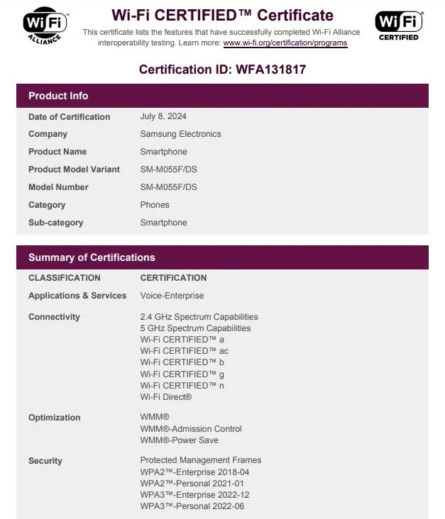 The Galaxy M05 and the Galaxy F05 have been spotted on the Wi-Fi Alliance platform, confirming that they exist, Samsung has almost completed their development, and the company could launch them soon.