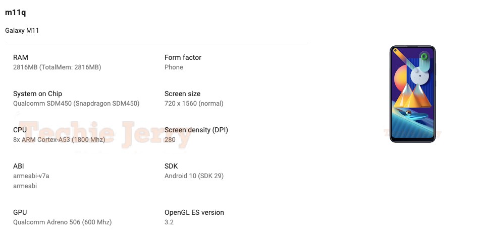 The listing discovered by Techie Jerry also contains a render of the Galaxy M11 which confirms several design choices along with some specs, such as the physical buttons located on the right edge of the phone, and the Infinity-O display with a corner cutout.