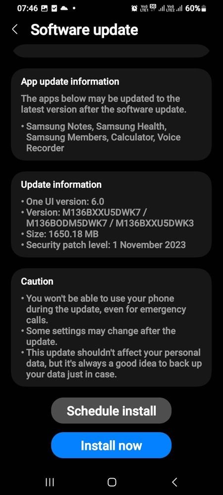 The Galaxy M13 5G is now getting the Android 14-based One UI 6.0 update in India. The update comes with firmware version M136BXXU5DWK7 and has a download size of 1.65GB. It also includes the November 2023 security patch, which is a bit disappointing considering that it is now January 2024, and Samsung could've included at least the December 2023 security patch with the new software update.