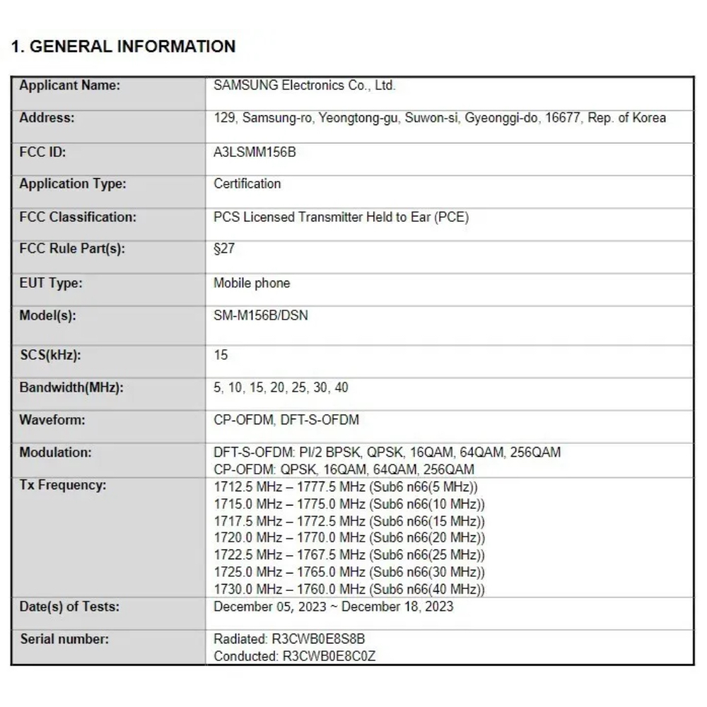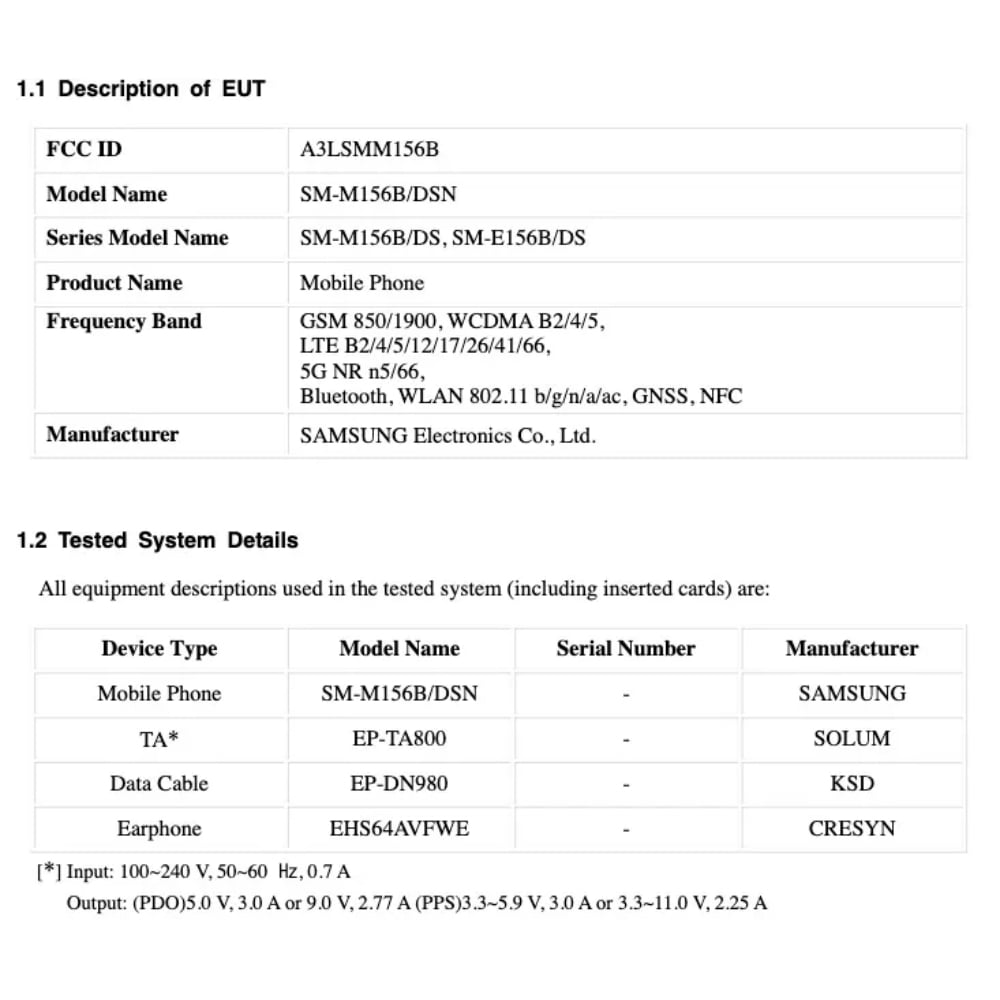 A new Samsung smartphone with model number SM-M156B/DSN has received certification (via MySmartPrice) from the FCC (Federal Communications Commission) with the FCC ID A3LSMM156B. The testing for the FCC certification was done in the first three weeks of December 2023. It will be launched as the Galaxy M15 5G, and it has 25W fast charging (9V & 2.77A). The phone has a 6,000mAh battery (5,880mAh rated), as revealed in a previous report. The phone has two 2G bands (850 and 1900), three 3G bands (B2, B4, and B5), eight 4G LTE bands (B2, B4, B5, B12, B17, B26, B41, and B66), and two 5G bands (5G NR N5 and N66).