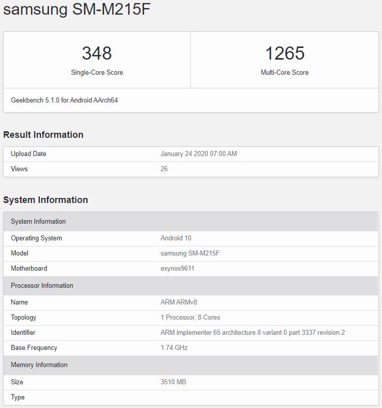 The benchmark further reveals that the Galaxy M21 runs Android 10 out of the box and it pairs the Exynos 9611 solution with 4GB of RAM. The original Galaxy M20 was also available with 4GB of RAM as an option instead of 3GB, but we suspect that the Galaxy M21 will offer 4GB for the base model, and possibly more than 4GB as an optional extra. Our sources told us that the Galaxy M21 will be available in three color options, namely black, blue, and a more exclusive violet flavor. In addition, two storage options – 64GB and 128GB – should be made available at launch.