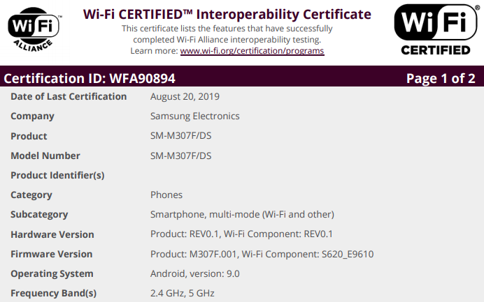 The Galaxy A10s, which launched last week, may soon be joined by the Galaxy M30s. The upcoming Galaxy M series phone with model number SM-M307F has just been certified by the Wi-Fi Alliance. Samsung also has devices such as the Galaxy A30s, A50s, M10s, and a few more in the works.