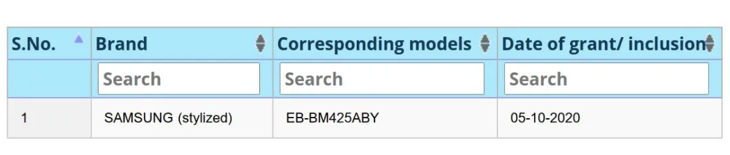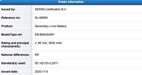 The Galaxy M42's (SM-M425F) battery with model number EB-BM425ABY has passed through 3C and DEKRA certification processes. Its capacity is rated at 5,830mAh, and Samsung will most likely market it as a 6,000mAh battery. The same battery also appeared in Indian certification agency BIS's database, which points towards the possibility of the Galaxy M42 launching in India soon.