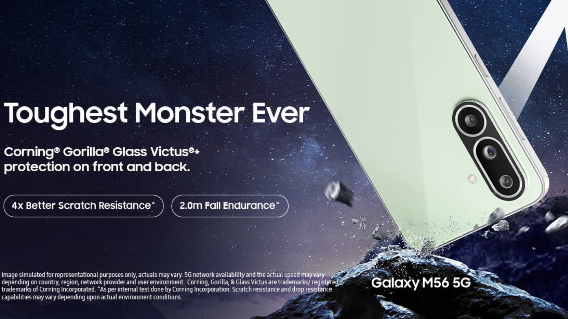 The upcoming phone also features improved durability, featuring Gorilla Glass Victus+, which is claimed to be 4x stronger than last year's phone. Samsung also claims the Galaxy M56 can survive falls from a height of up to 2 meters. Its Super AMOLED+ screen is 33% brighter and has 36% slimmer bezels. It also features Vision Booster.