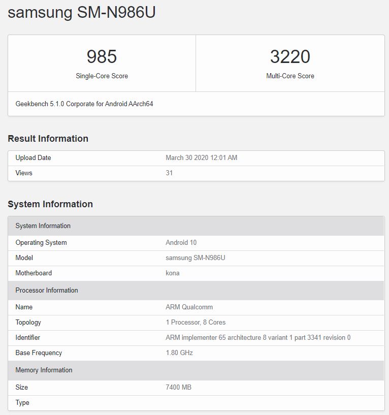 The motherboard is codenamed ‘kona,' which means that the Galaxy Note 20+ 5G is equipped with Qualcomm's Snapdragon 865 chipset – same as the Galaxy S20 series in regions where it doesn't employ the in-house Exynos solution instead. This makes sense, given how the SM-N976U model number corresponds to the US market, where the Snapdragon solution is preferred by Samsung.
