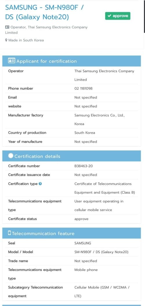 As yet, the NBTC doesn't seem to have approved the 5G models of the Galaxy Note 20 flagship series, but that's not to say the duo will be limited to LTE connectivity. Samsung had already released a couple of 5G phones in Thailand, including the Galaxy A71 5G as well as the Galaxy S20 Ultra 5G, so there's a strong possibility that early 5G adopters in Thailand will have the opportunity to buy the 5G-enabled Galaxy Note 20 or Note 20 Ultra sooner or later.