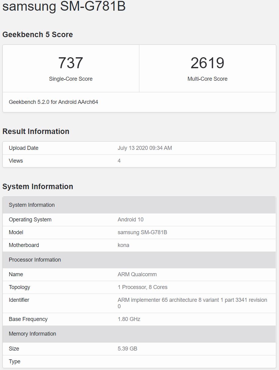 Hopefully, Samsung would do what it did with the Galaxy S10 Lite and not split the device in Snapdragon/Exynos variants. The Galaxy S10 Lite was shipped with the Snapdragon 855 globally and we can hope that the Galaxy S20 Fan Edition will do the same with the SD865. The geekbench listing for the SM-G781B reveals the Snapdragon 865 chipset paired with 6GB of RAM. The device posted single-core and multi-core scores of 737 and 2619 respectively.