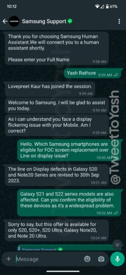 In India, Samsung has confirmed (via Yash Rathore) that it will offer free screen replacement to Galaxy S20, Galaxy S20+, Galaxy S20 Ultra, Galaxy Note 20, and Galaxy Note 20 Ultra units that have been affected by the green/pink line issue. On top of the screen replacement, the company is also offering free battery and kit replacement for these affected units. The confirmation was done by a Samsung India Support executive via the WhatsApp support channel.