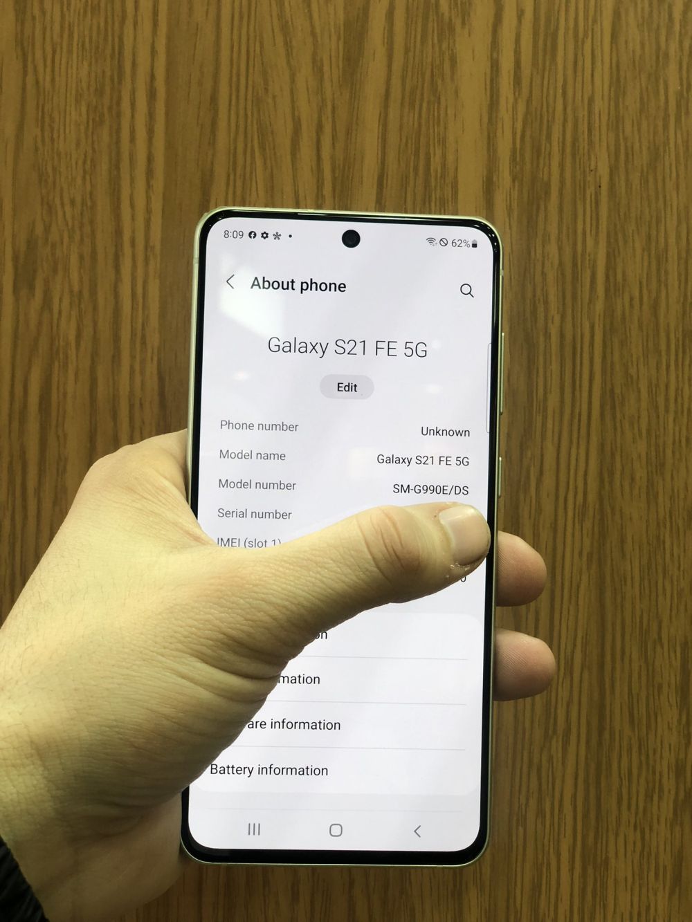 The front view of the phone reveals model number “SM-G990E,” meaning this is the Galaxy S21 FE variant powered by the Exynos 2100 SoC. It's supposed to go on sale in the majority of Asian markets.