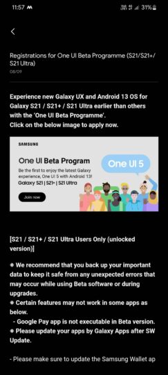 The Android 13-based One UI 5.0 beta program is available for unlocked Galaxy S21 models, and the pre-release firmware — once available — comes with a few caveats. Firstly, there are the usual bugs people should expect from beta software. Next, Galaxy S21 users in India should back up their data before applying to join the beta program to avoid losing anything of value. Finally, Some apps and features may not work, and Google Pay is among them.
