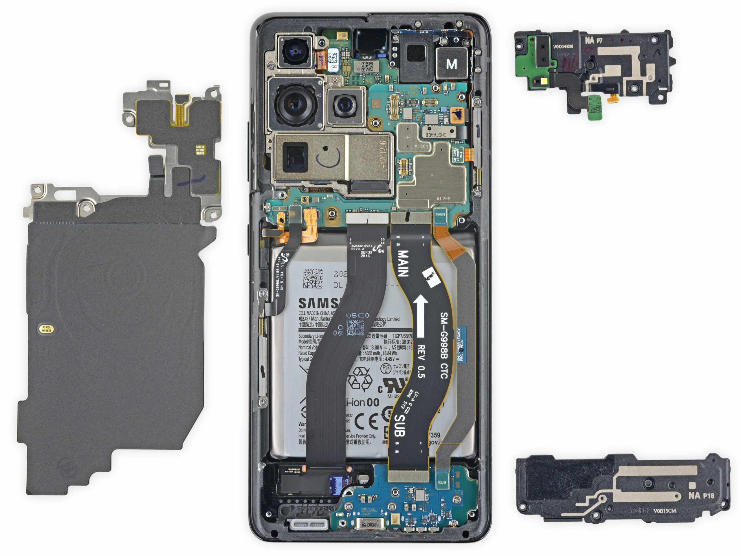 The step-by-step teardown from iFixit shows all the important components of the Galaxy S21 Ultra. Apparently, the SIM tray and vibration motor have traded places when compared to the Galaxy S20 Ultra. Moreover, the periscope camera is much bigger, and the wireless charging coil has more windings (for more efficiency). The quad-camera setup's lenses can be replaced individually, which is a good thing.