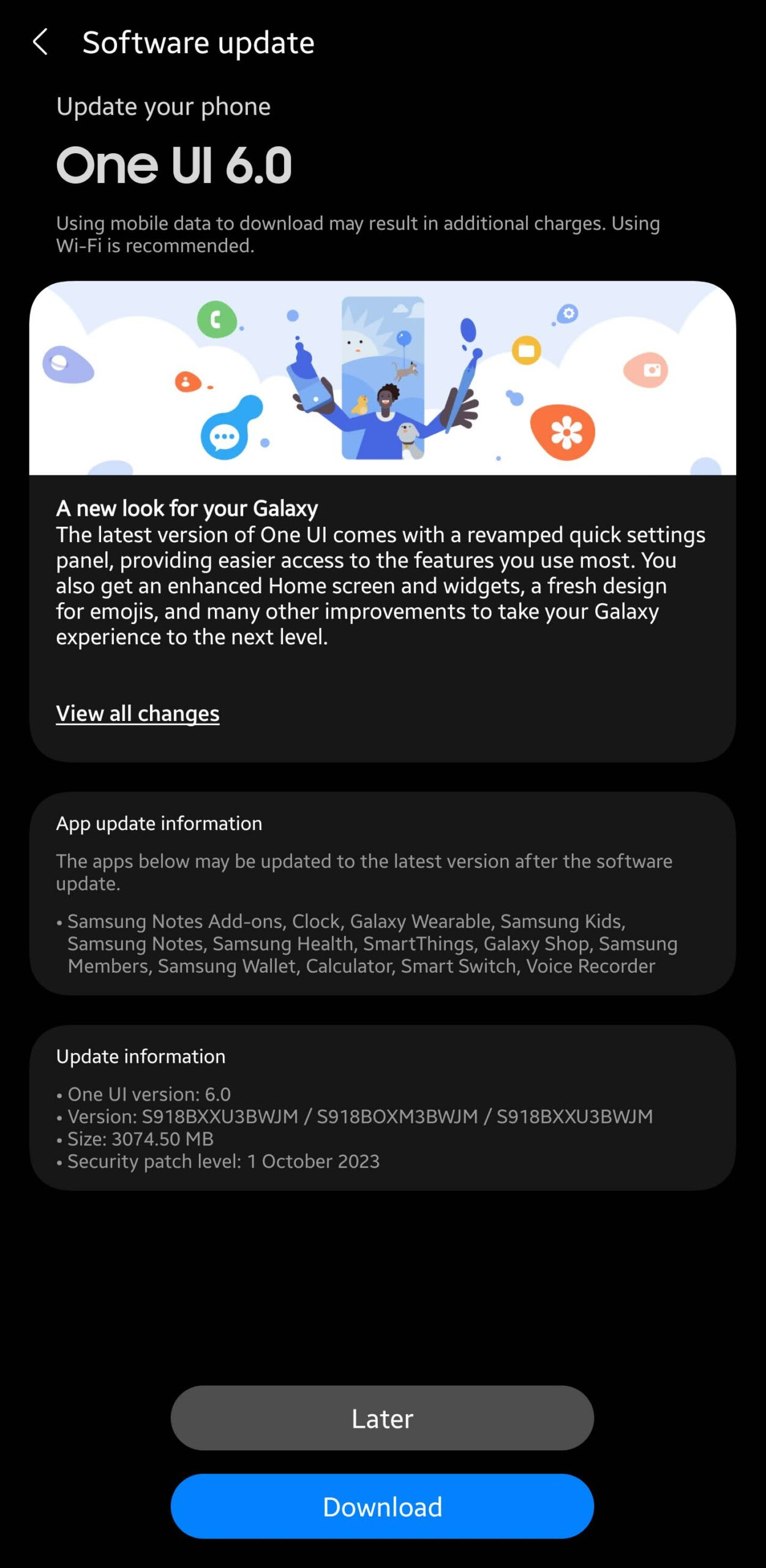 The Android 14-based One UI 6.0 update is now available for the Galaxy S23, Galaxy S23+, and Galaxy S23 Ultra in Australia. The update comes with firmware version S91xBXXU3BWJM, and it has a download size of around 3,074MB. Unfortunately, it doesn't include the November 2023 security patch that Samsung started rolling out to a few phones over the past week.