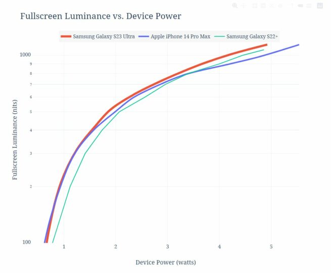 As per this demonstration, the Galaxy S23 Ultra and the iPhone 14 Pro Max are on equal footing in terms of screen brightness and energy consumption, but only up to a point. After roughly 400 nits, the Galaxy S23 Ultra display shows a higher energy efficiency. And at 1150 nits of fullscreen brightness, in HBM (high brightness mode), the Galaxy S23 Ultra display uses roughly 600 mW less than the iPhone 14 Pro Max.