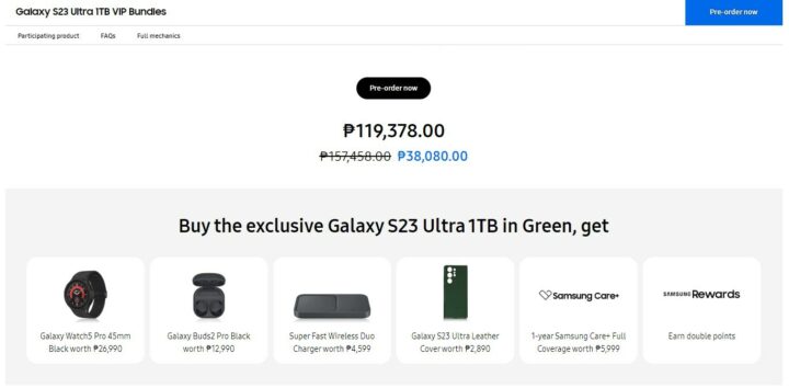 Speaking of the Galaxy S23 Ultra VIP Bundle, the package will include the Galaxy S23 Ultra 1TB version, Galaxy Watch 5 Pro 46mm, Galaxy Buds 2 Pro, Super Fast Wireless Duo Charger, Galaxy S23 Ultra Leather Cover, and 1-year Samsung Care+ coverage plan for a discounted price of PHP 119,378 (approx. $2,200), the actual price of which is PHP 157,458, saving you PHP 38,080.