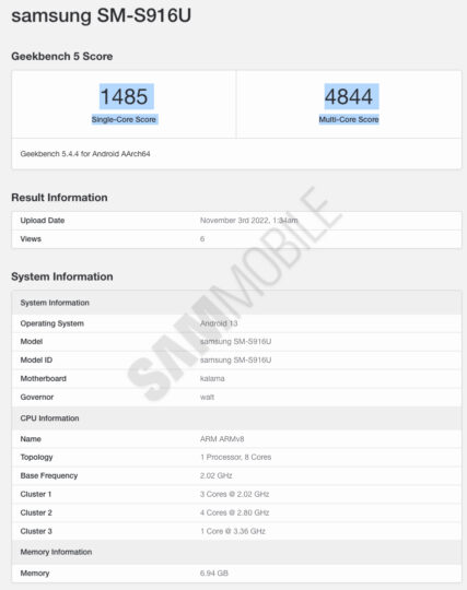 The unlocked US version of the Galaxy S23+ (SM-S916U) was spotted in Geekbench's database, revealing the Snapdragon 8 Gen 2 processor (with Adreno 740 GPU), 8GB of RAM, and Android 13 operating system. It also means that the Galaxy S23 and the Galaxy S23 Ultra will feature the same processor. The Asian and European versions of the phones will reportedly feature the same processor.