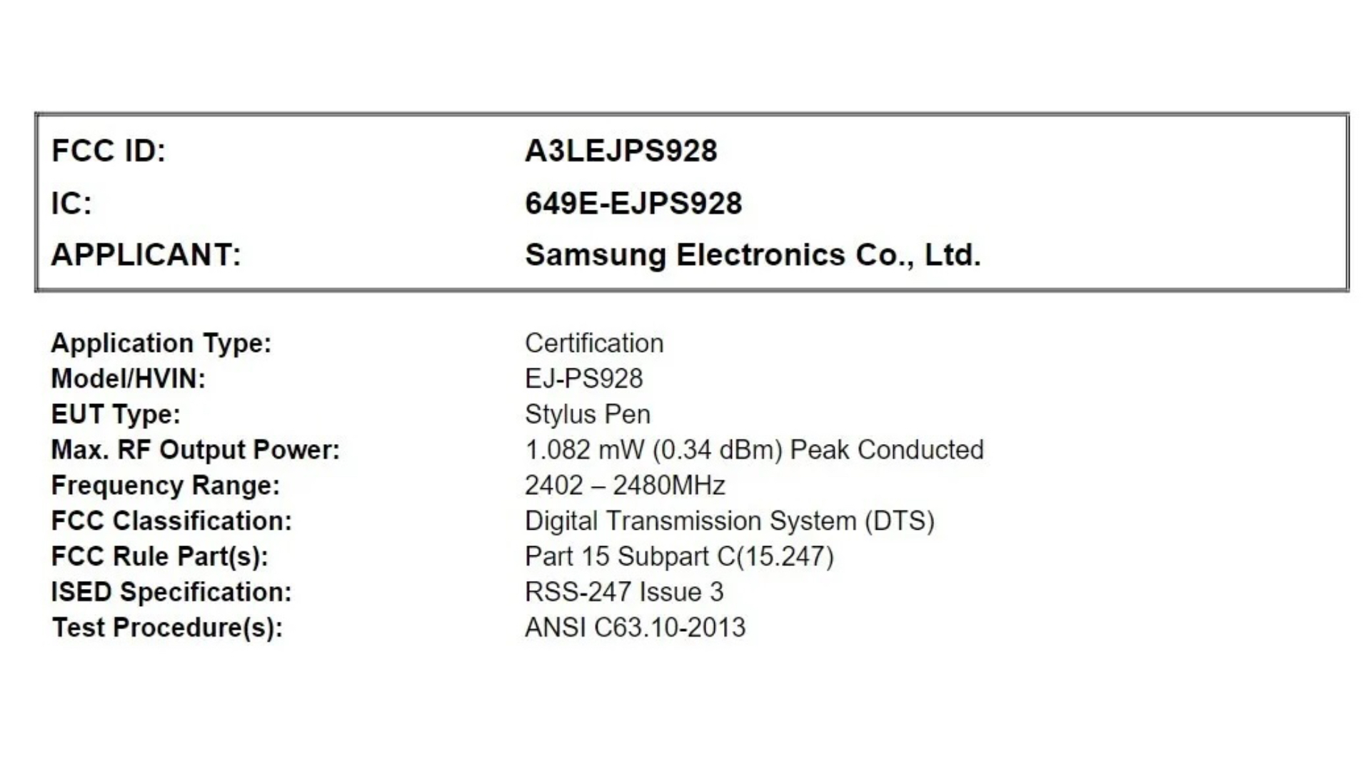 The S Pen can be seen in its Grey/Graphite color in the image above, but it should be available in more colors. Its frequency range, as per FCC documents, is 2,402 – 2,408MHz, while its maximum RF (Radio Frequency) output power is 1.082mW. You can see more details in the images below. It isn't clear whether the S Pen carries an IP68 rating for dust and water resistance.