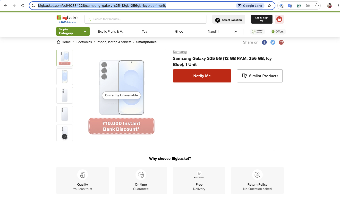 One of India’s biggest online grocery ordering platforms, BigBasket has started showing posters in its app about delivering Galaxy S25 series smartphones within 10 minutes in select places around the country. We couldn’t find it at our location in Hyderabad, Telangana. However, we did come across the listings of the phones on its website.