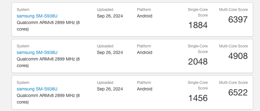 For example, in the screenshot below, you can see a few early Galaxy S25 Ultra (SM-S938U) tests that have yielded unusually poor performance figures. Will they reflect the phone's benchmark performance at launch? Certainly not.