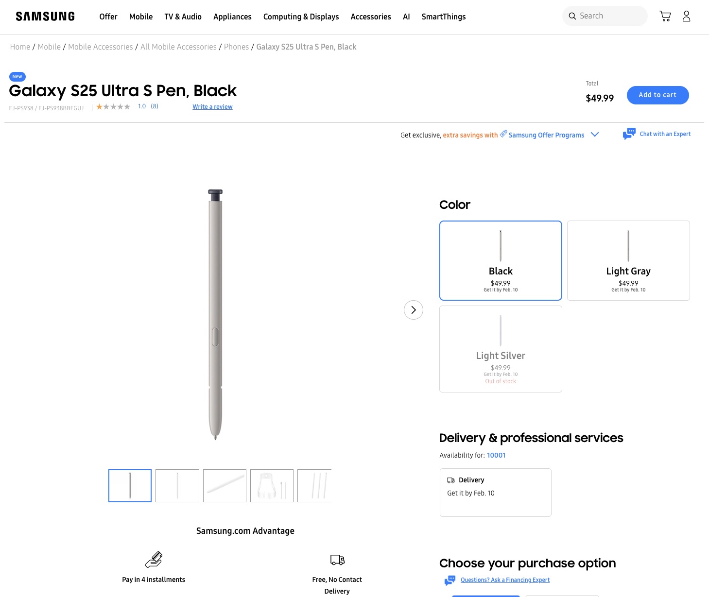 Samsung has started selling the official replacement S Pen (EJ-PS938B) for the Galaxy S25 Ultra. It is priced at $50 in the USA and comes in Black, Light Gray, and Light Silver colors. That's the same price as that of the replacement S Pen for the Galaxy S24 Ultra.