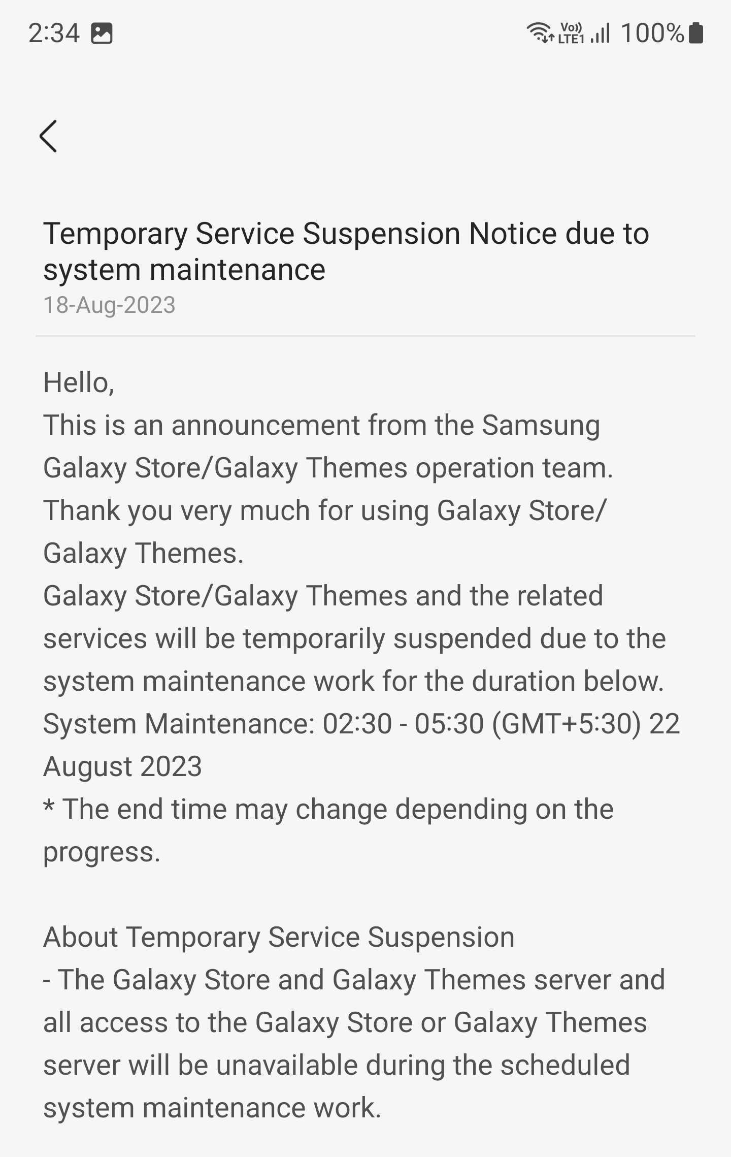 The Galaxy Store and Themes servers will be down on August 22 between 2:30 – 5:30 (GMT+5:30 / Mumbai time). It's unclear if the servers will be down worldwide or only in India, but they should be back up and operating within a few hours.