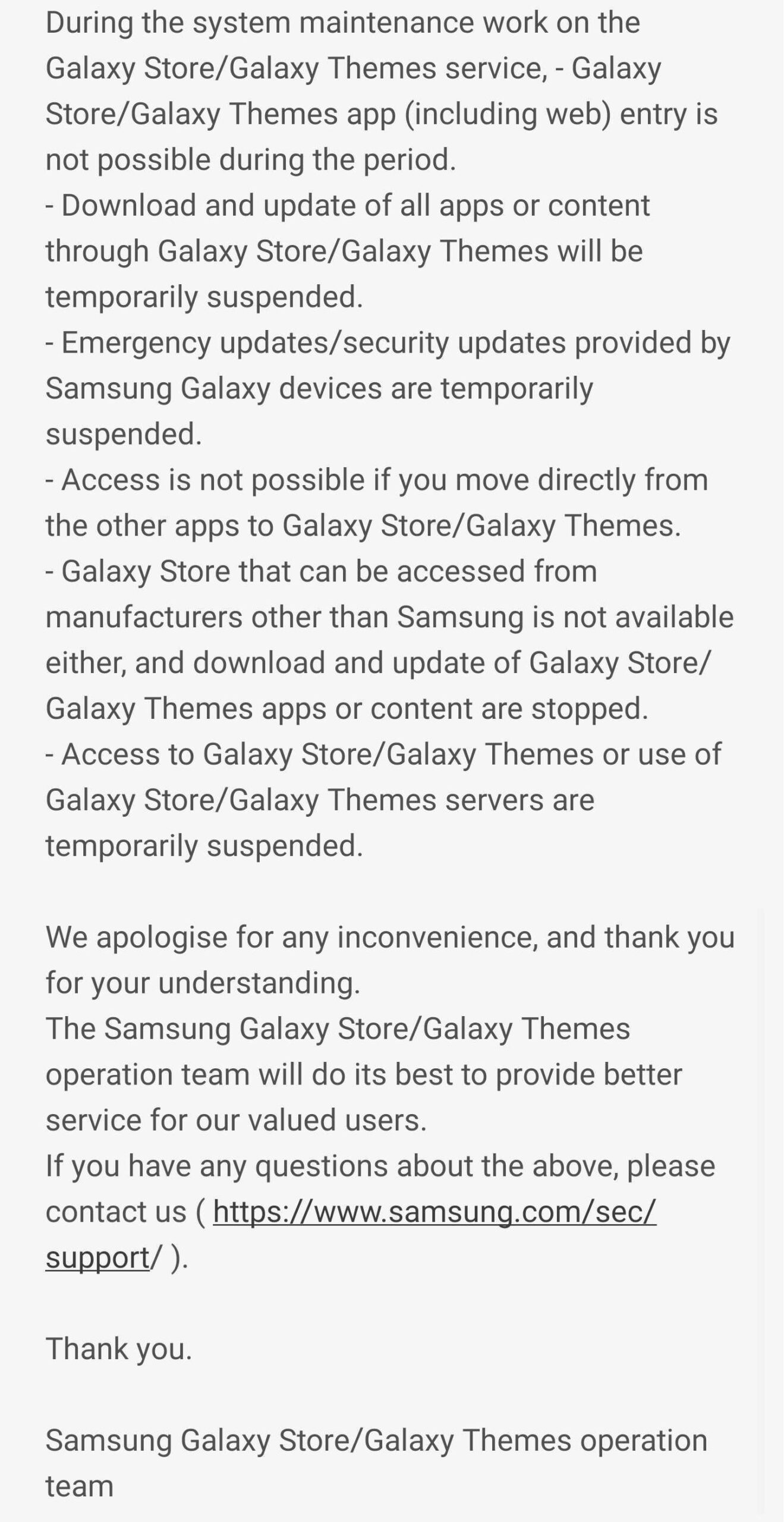 Even app developers won't have access to the Store or be able to update their apps. Samsung should bring the Store and Themes services online after a few hours, but as usual with maintenance work, the company doesn't deny the possibility that the end time may change depending on the progress.