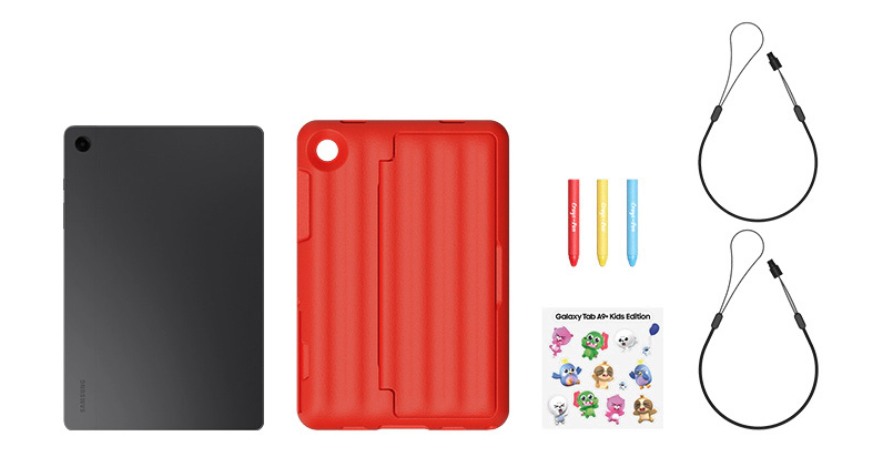 For this mere $10 extra, what you're getting with the Galaxy Tab A9+ Kids Edition is the tablet itself preloaded with the Samsung Kids app, a thick Puffy Cover case with a built-in kickstand, three Crayo-Pens, two interchangeable stylus tethers, and a Stickers Pack featuring Samsung Kids cartoon characters.