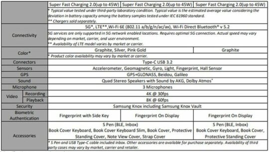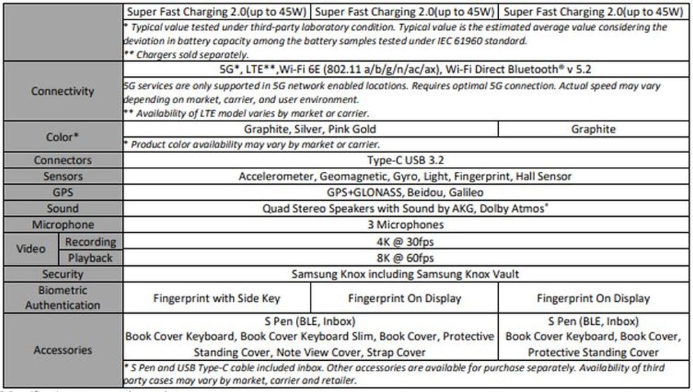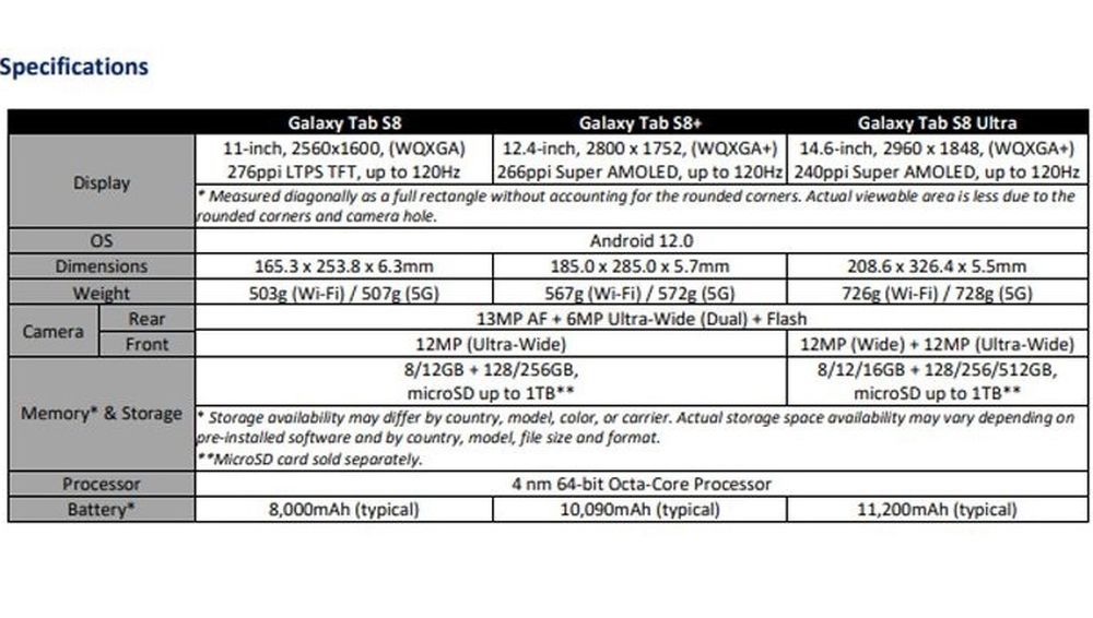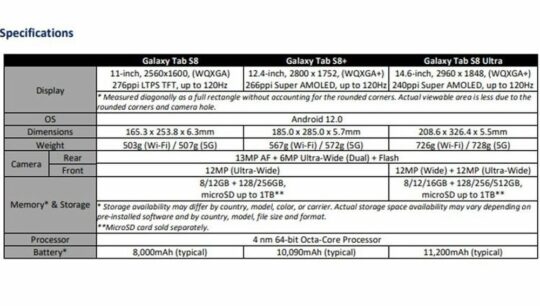 According to the leaked press release, the Galaxy Tab S8 series has the following hardware specifications: