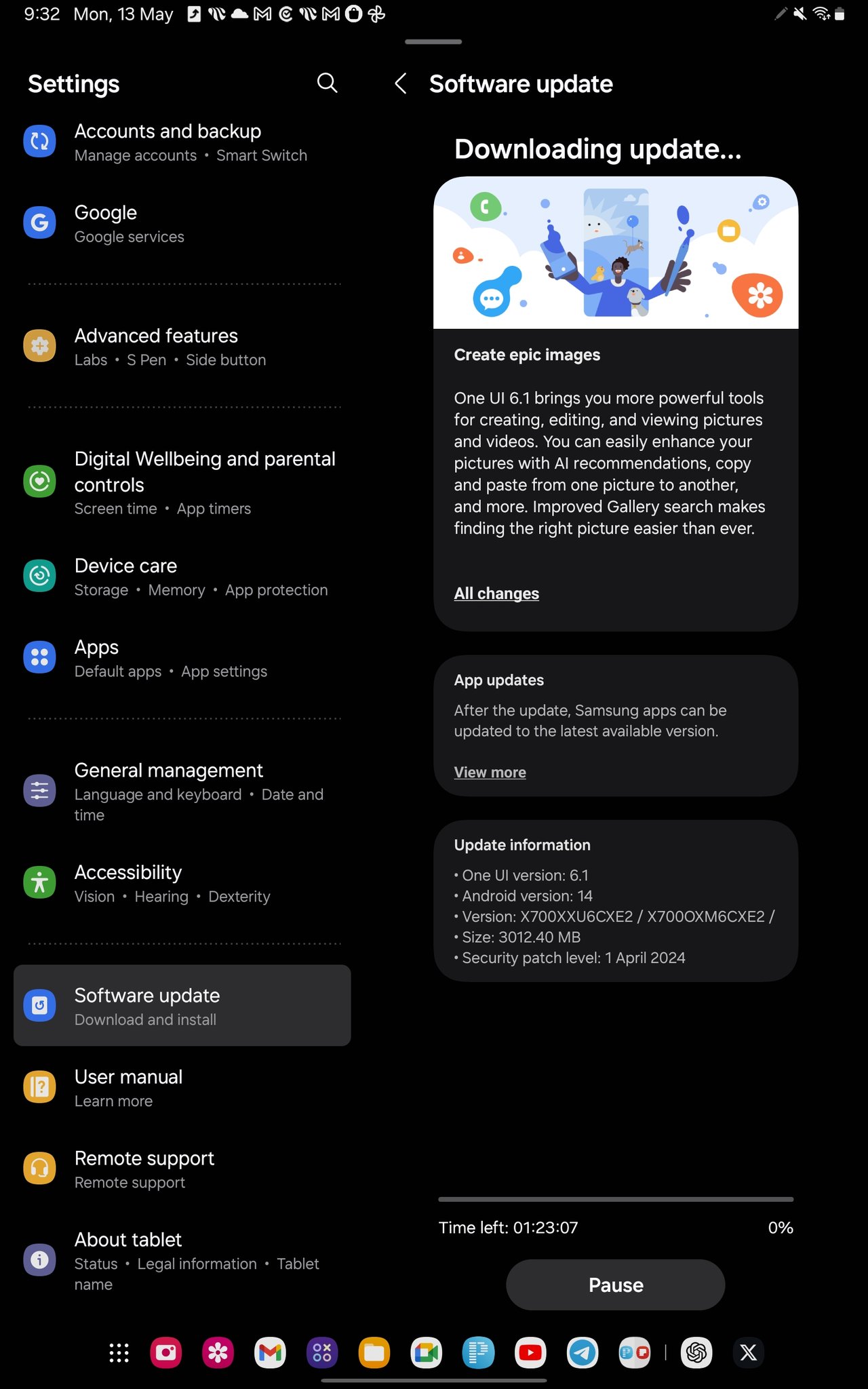 Samsung's One UI 6.1 update, based on Android 14, comes (via @tarunvats33) with firmware version X700XXU6CXE2 for the Galaxy Tab S8 in India. For the Galaxy Tab S8+ and the Galaxy Tab S8 Ultra, the One UI 6.1 update comes bearing firmware versions X800XXU6CXE2 and X900XXU6CXE2, respectively. This is a huge update, clocking in at over 3GB in file size, so we advise you to download the update via a Wi-Fi network.