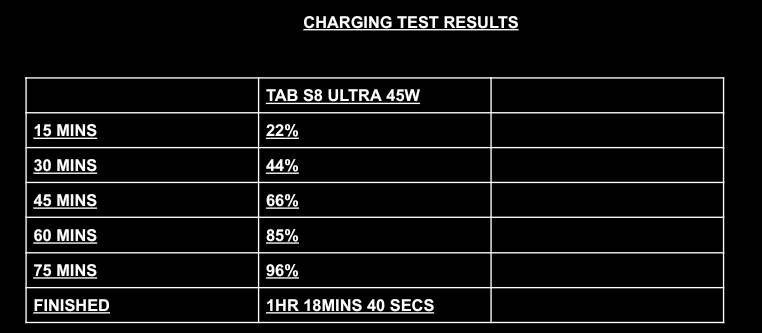 The Galaxy Tab S8 Ultra delivered on Samsung's promise, and then it pushed the bar even higher. Our Tab S8 Ultra went from 1% to 100% charge in 1 hour and 18 minutes, so it was about 4 minutes faster than Samsung's official estimate.