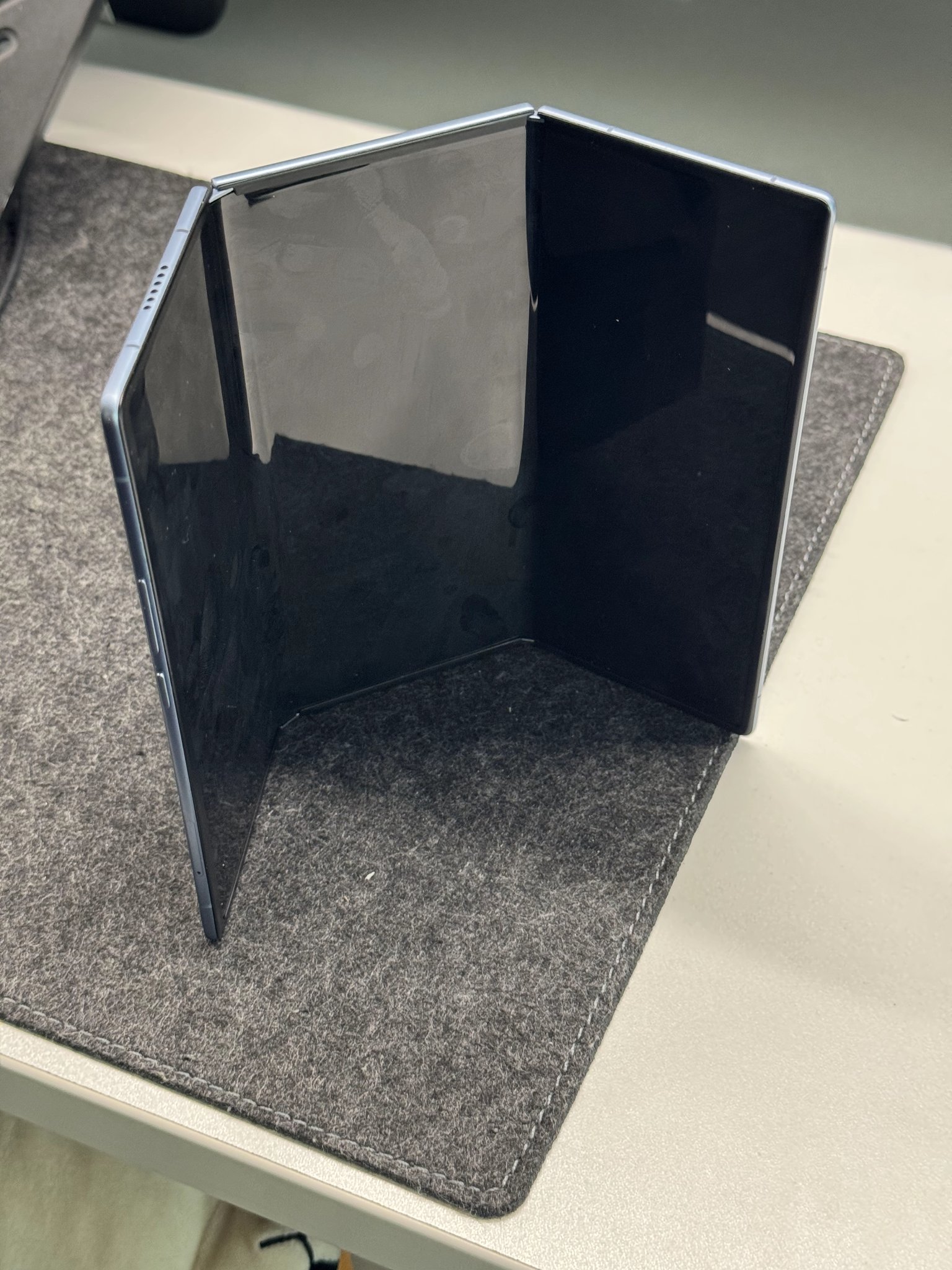 The Huawei Mate XT Ultimate, which is the only tri-folding phone in the world on sale right now, also has a screen with three parts. However, its mechanism is completely different. One of its hinges folds inwards, while the other folds outwards, leaving the screen exposed to the environment near one of the hinges. That makes the display prone to getting damaged in case the device suffers a fall.