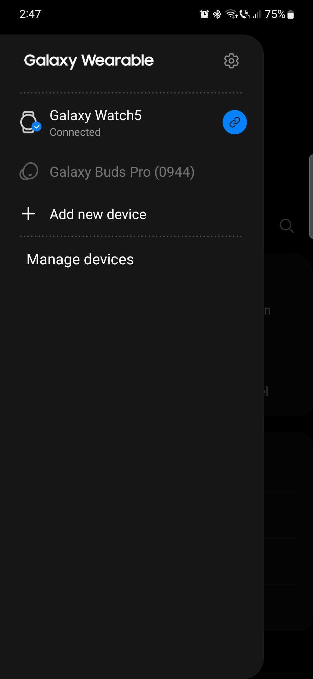 You can access the smartwatch section in Galaxy Wearable via the hamburger menu. There, you have access to an overview of your active watch face, the name of your device, and how much battery charge it has left.