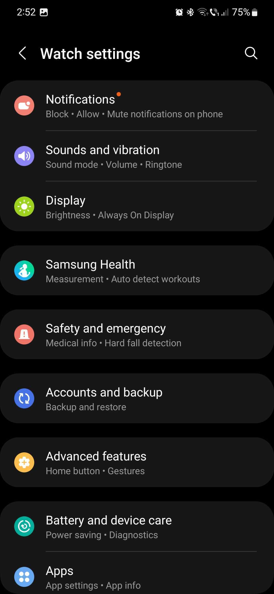 The Watch Settings screen lets you change the behavior of your smartwatch, from notifications, to display settings, sounds and vibration, workout detection and health sensor settings, safety and emergency features, and more. In essence, this is where you set up your Galaxy smartwatch to behave as you want it to.
