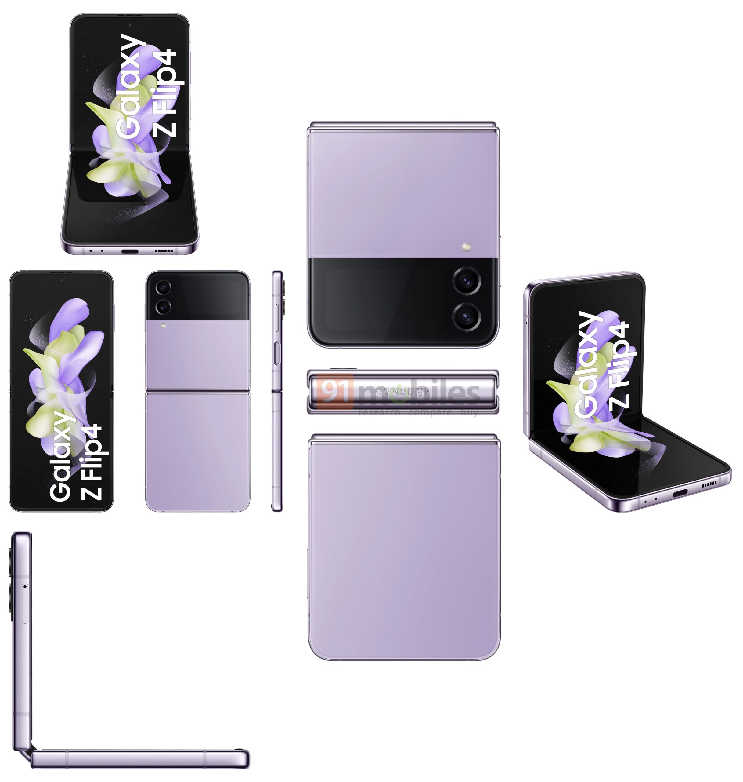 Evan Blass (@evleaks) has published press renders of the Galaxy Z Flip 4 and the Galaxy Z Fold 4 on 91Mobiles. The Galaxy Z Fold 4 can be seen in Beige/Cream, Black, and Grey, while the Z Flip 4 is visible in Black, Bora Purple, Light Blue, and Rose Gold. Both phones seem extremely identical to their predecessors.
